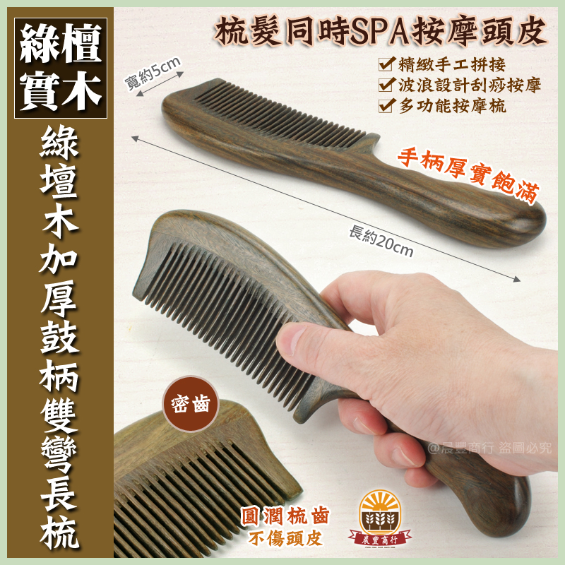 ★商品名稱: 綠壇木加厚鼓柄雙彎長梳(總長20cm)/頭皮按摩神器/木製經絡按摩梳