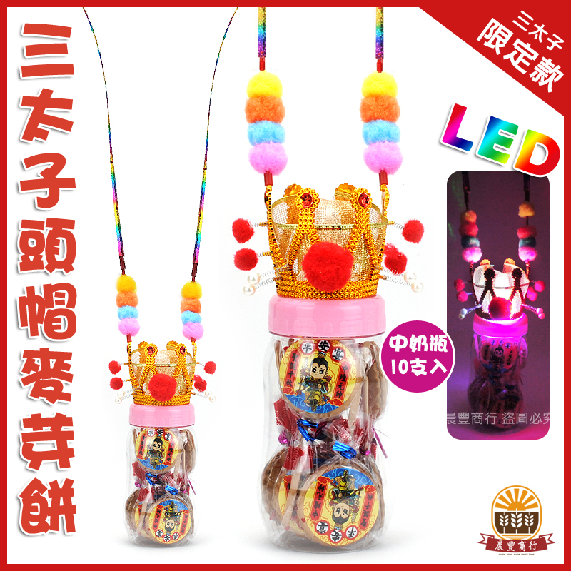 ★商品名稱: 三太子LED頭帽麥芽餅奶瓶裝/10入/三太子最愛麥芽餅
