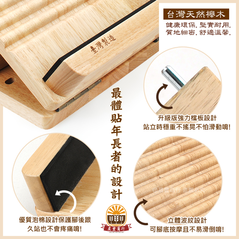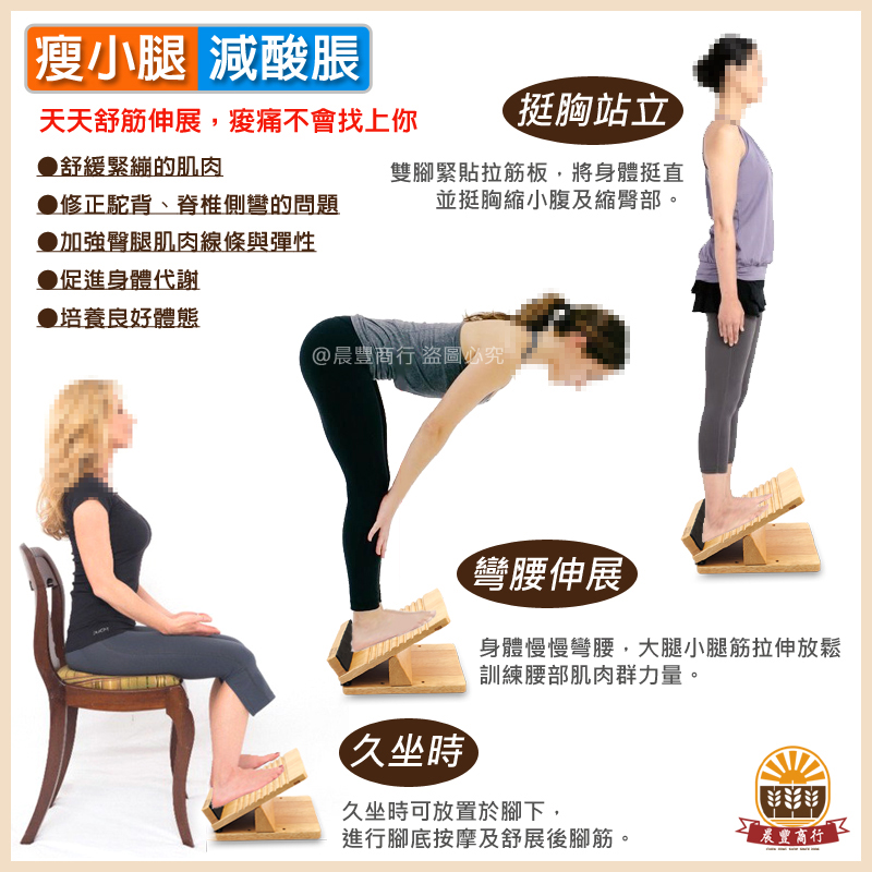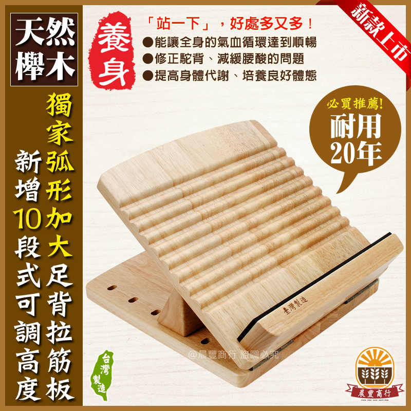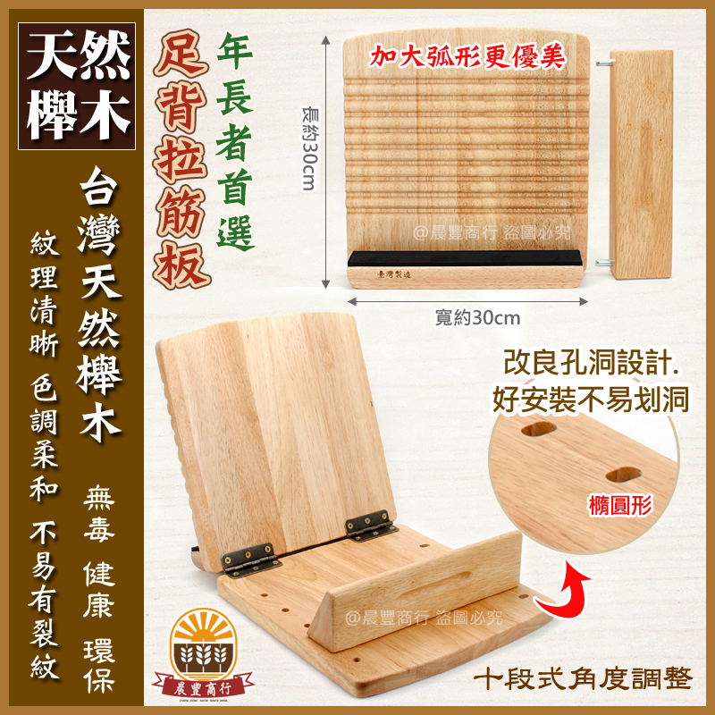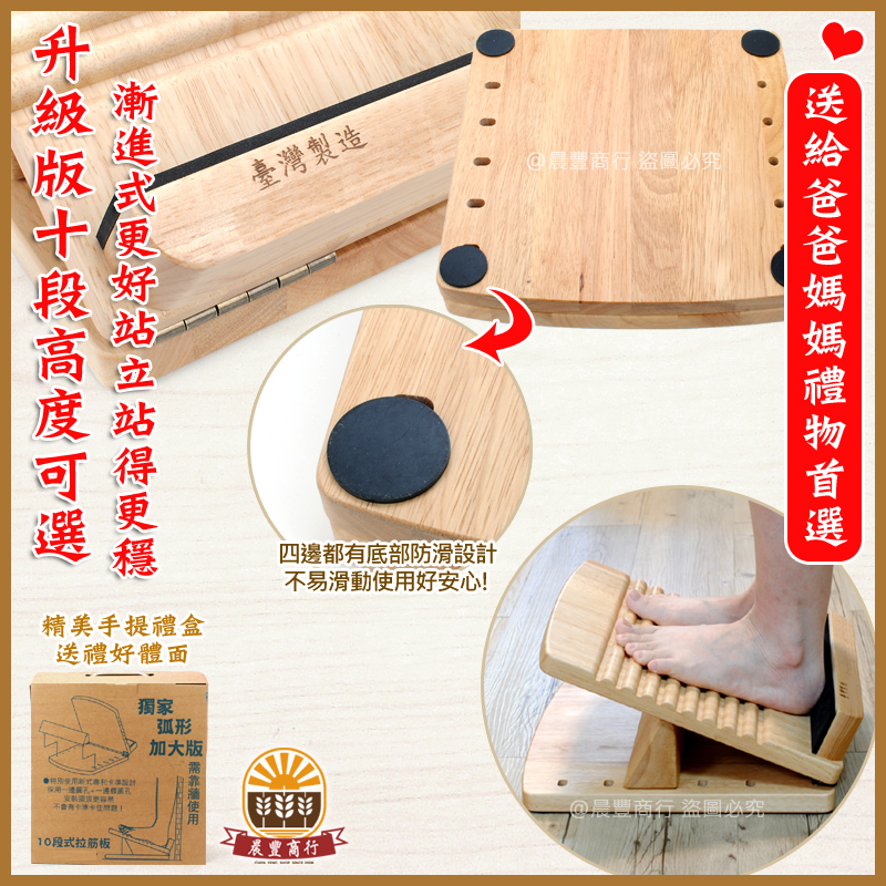 ★台灣製十段拉筋板,以漸進式拉伸練習,放鬆筋骨、健康舒活,並幫助舒緩壓力。100%天然原木製造,柔軟泡棉護腳後跟,深凹刻紋按摩腳底穴道,人體工學研發可調式特殊角度,不滑動且強力固定於底板,柔化拉伸肌肉和關節,減輕關節所受的壓力,同時保持良好體態!