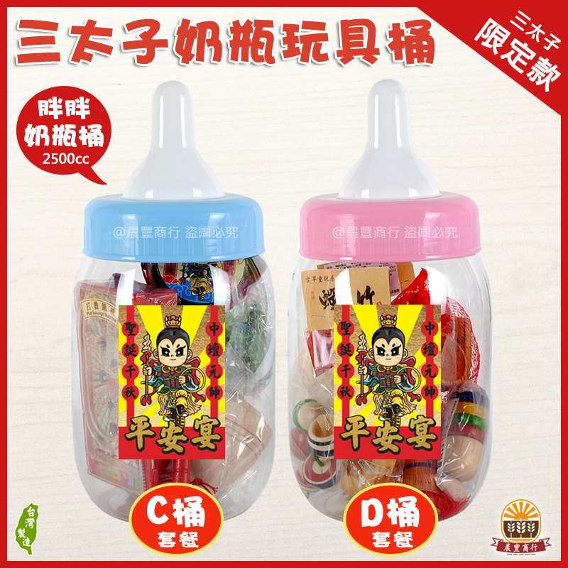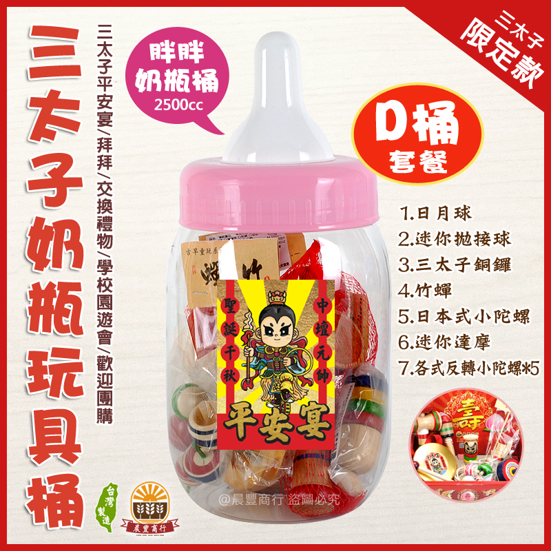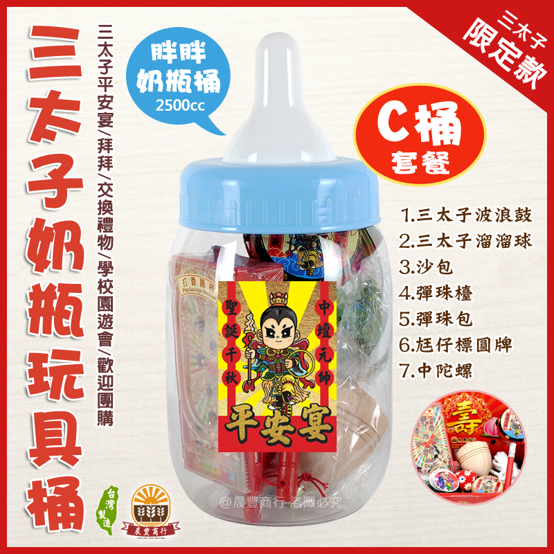 ➡️ (C桶套餐): 1.三太子波浪鼓 2.三太子溜溜球 3.沙包 4.彈珠檯 5.彈珠包 6.尪仔標圓牌 7.中陀螺+超大奶瓶