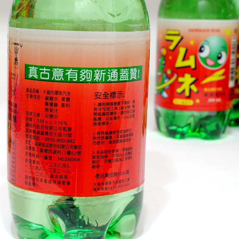 ★彈珠汽水是在台灣極受歡迎的碳酸清涼飲料,英文名稱為「Ramune」、日文名稱「ラムネ」來自英文的 「lemonade」(レモネード,檸檬水),其特殊的包裝方式是用一顆玻璃珠封口,瓶頸兩側凹入,要喝時將彈珠壓入,使之掉落在瓶頸處即可飲用。