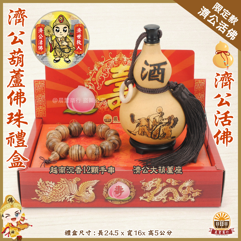★規 格: 濟公大葫蘆酒壺座10cm×1越南沉香12顆手串×1,濟公活佛主題禮盒×1